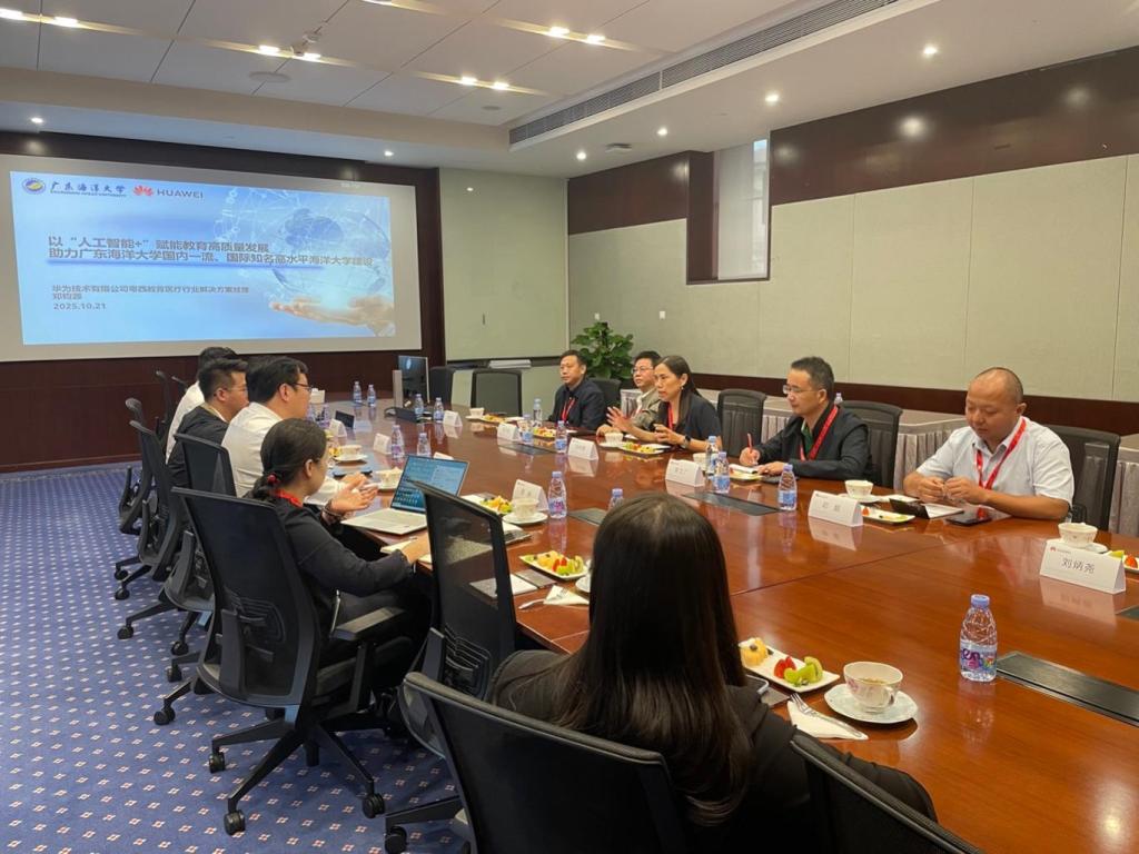 随后,双方围绕多项合作议题展开座谈交流。华为技术专家介绍了公司在云计算、人工智能、鸿蒙系统等方向的技术布局与业务进展,刘利群介绍了广东海洋大学计算机科学与工程学院的学科特色与人才培养目标。双方就省级XC产业学院的发展与校企合作、低空技术与工程硕士点学科建设、人工智能与物联网等专业的人才培养改革,以及学院智算中心的升级改造与校企共建等议题进行了深入探讨。
