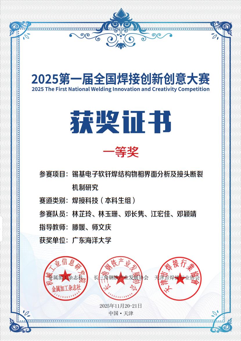 本次大赛以“创意引领、数字赋能、绿色焊接、智造未来”为主题,由机械工业信息研究院、机械工业出版社、长三角钢铁产业发展协会等单位共同主办。大赛分为“焊接科技”与“焊接工程”两大赛道,共收到来自全国高校、企业的90多个作品。20日下午的决赛答辩中,我院参赛团队以清晰的逻辑、精准的数据和生动的演示,系统阐述了项目在“锡基焊料界面物相演化”与“焊接接头断裂机制”方面的突破性成果,展现了良好的专业素养与团队协作精神,获得评审组一致认可。
