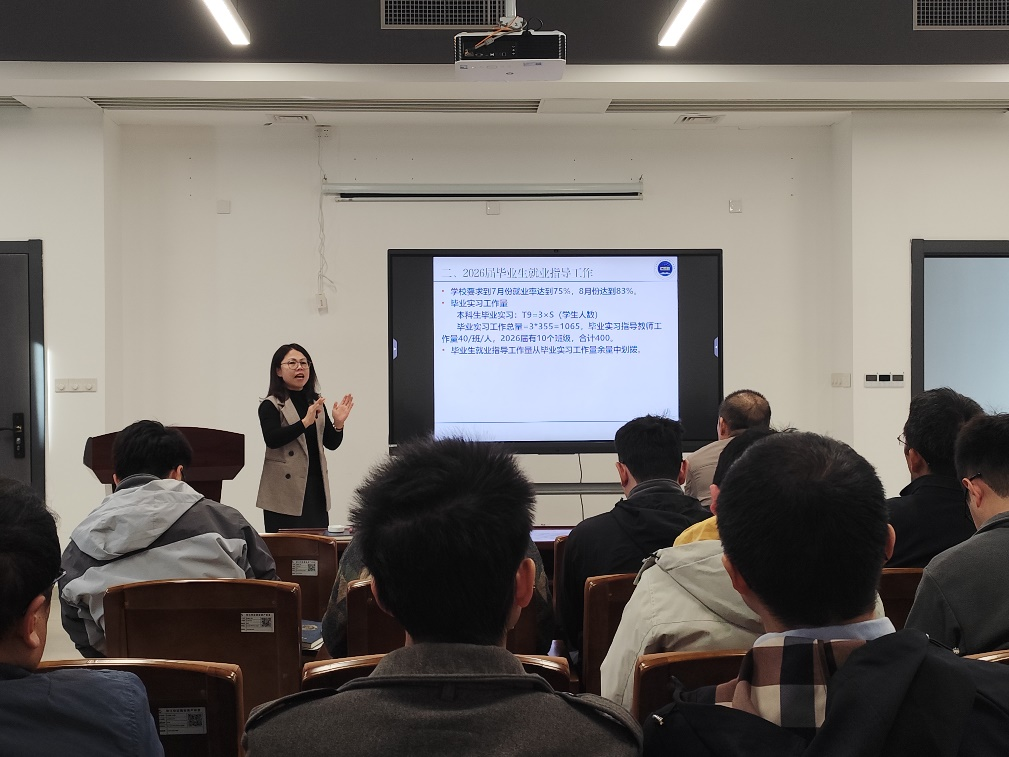随后,赵男男副院长传达了学校2026届毕业生就业工作总体部署,并对毕业论文和就业升学等重点工作作出具体安排。她强调全院教师要以高度的责任感抓实抓细各项工作:毕业论文指导教师需严格对标时间节点,全程跟进指导,确保学生高质量完成论文撰写,达到毕业要求;毕业班班主任和辅导员要常态化跟踪学生毕业及就业进展,精准开展就业创业指导。全院上下要协同发力,凝聚就业工作齐抓共管的强大合力。
