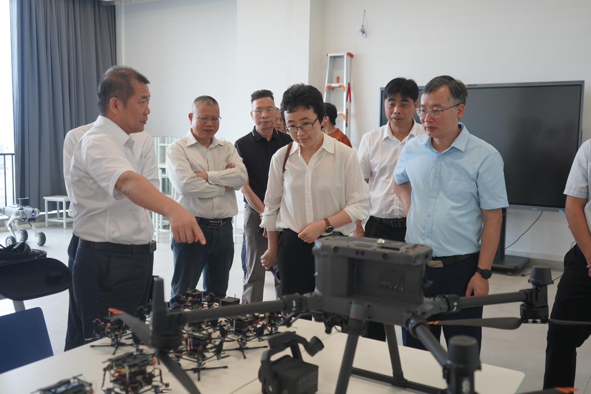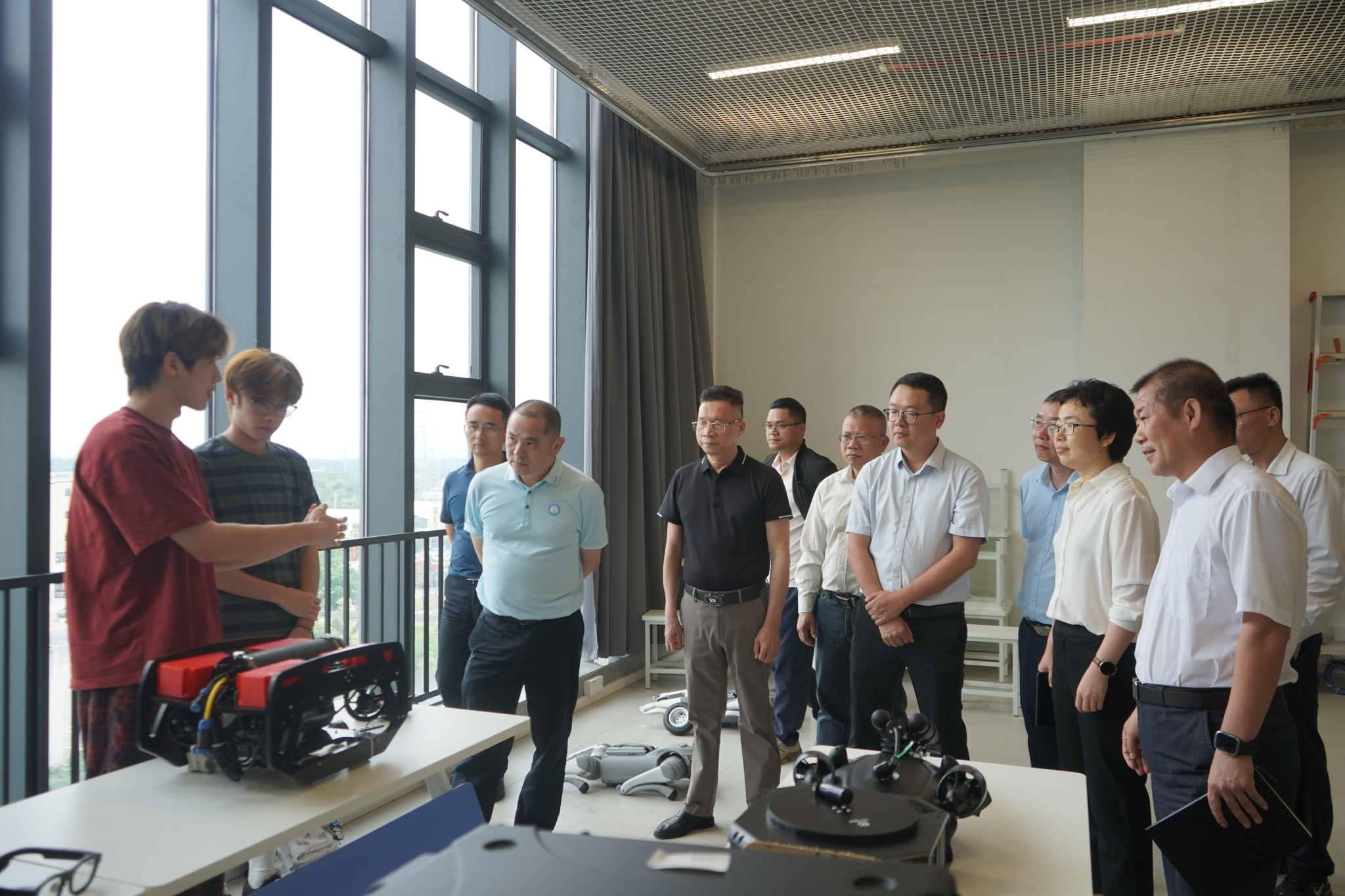 调研团一行走进人工智能校内实习实训室,学生团队现场展示了自主研发的“鲲鹏”水下机器人、脑机接口设备等前沿成果,详细讲解了设备的核心技术、功能特点与应用场景。调研团成员认真观摩、细致询问,对学生团队的创新能力和科研成果给予充分肯定。