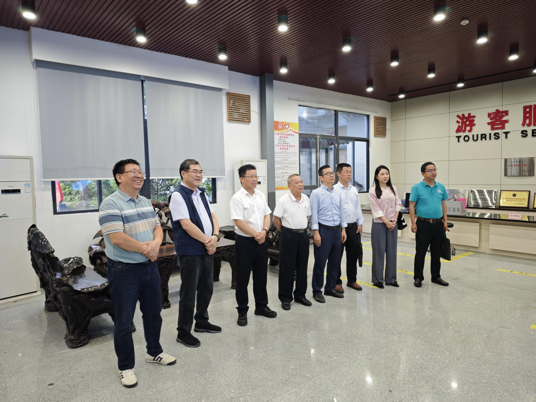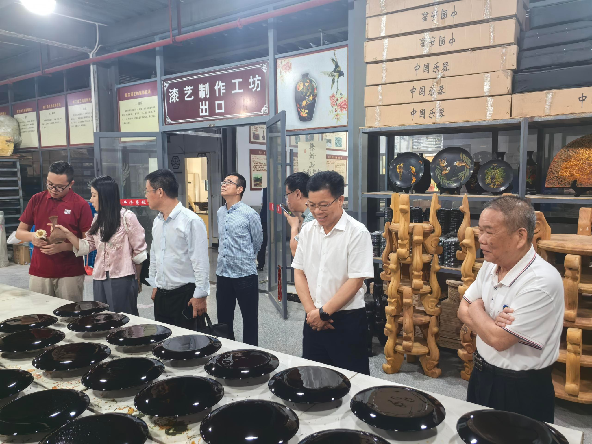 在阳江漆艺院理事长杨阁陪同下,丁永成一行先后参观了阳江漆器历史展厅、漆艺大师工作室、漆工艺作坊、教学实习室与产品展销厅,详细了解国家级非遗“阳江漆器髹饰技艺”的历史传承、制作工艺、文创研发与人才培养现状。