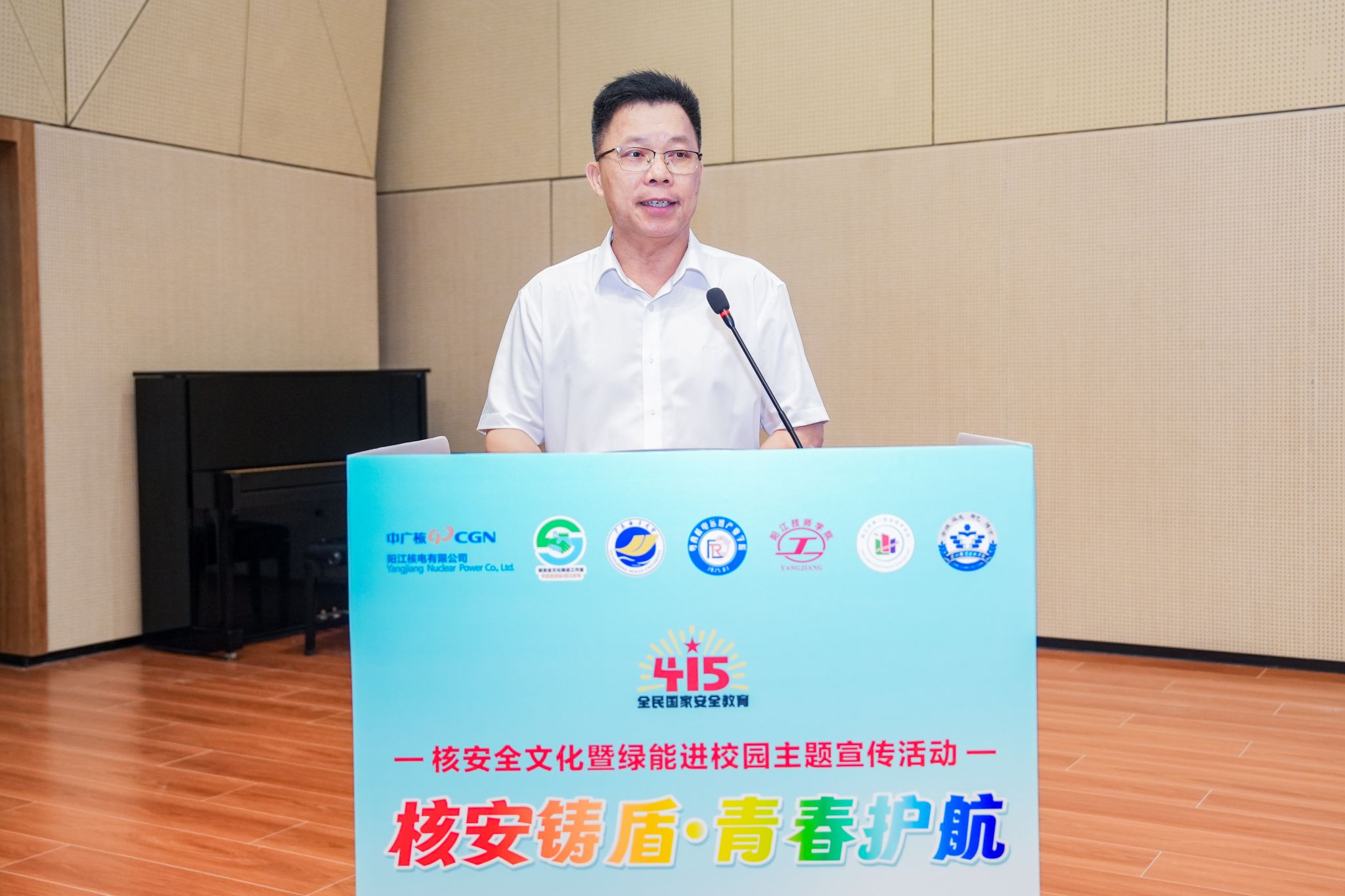 4月8日,在“4・15”全民国家安全教育日来临之际,阳江校区联合阳江核电有限公司举办“核安铸盾・青春护航 —— 核安全文化暨绿能进校园”主题宣传活动。生态环境部华南核与辐射安全监督站副处长周融冰、阳江核电有限公司副总工程师李辉、阳江校区党委副书记丁永成、阳江技师学院(阳江市第一职业技术学校)副校长洪海、阳江职业技术学院机电系党总支书记黄礼万、阳江校区相关部门负责人及师生代表近300余人参加活动。
