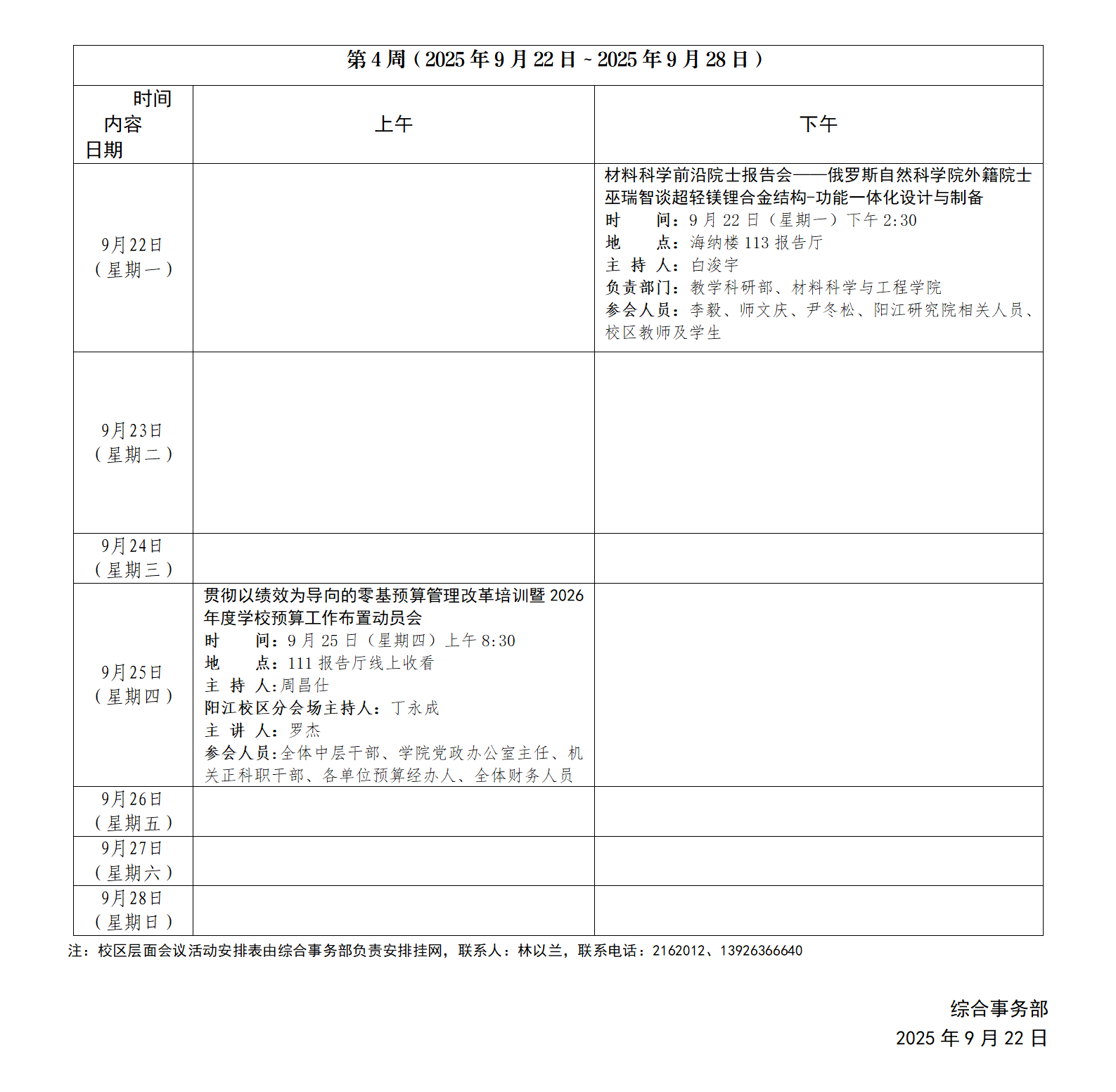 2025~2026学年第一学期第4周会议活动安排表
